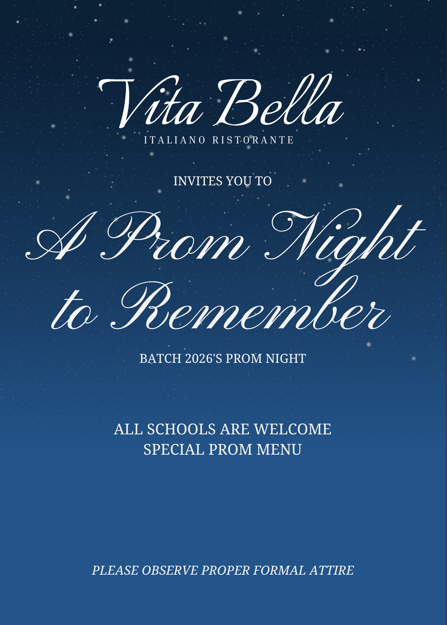 Prom Night at Vita Bella ✨ An Elegant Italian Experience for Every High School Prom Make your prom night unforgettable with a special evening at Vita Bella Italiano Ristorante. We’re rolling out an exclusive Prom-Priced Menu designed just for area high school students — offering a refined, upscale dining experience at a price that fits your night. Celebrate with your friends before the dance (or after!) and enjoy a beautifully curated Italian menu, warm ambiance, and five-star service that makes you feel like true VIPs. From classic pastas to signature entrées and decadent desserts, every detail is crafted to elevate your prom celebration. 📸 Perfect for photos 🍝 Elegant Italian dishes 🔥 Cozy, romantic atmosphere 🎉 Special prom pricing for students Spots fill quickly during prom season — reserve your table now and make Vita Bella part of your most memorable night of the year. Prom Menu available for all area high school students. Reservations required.