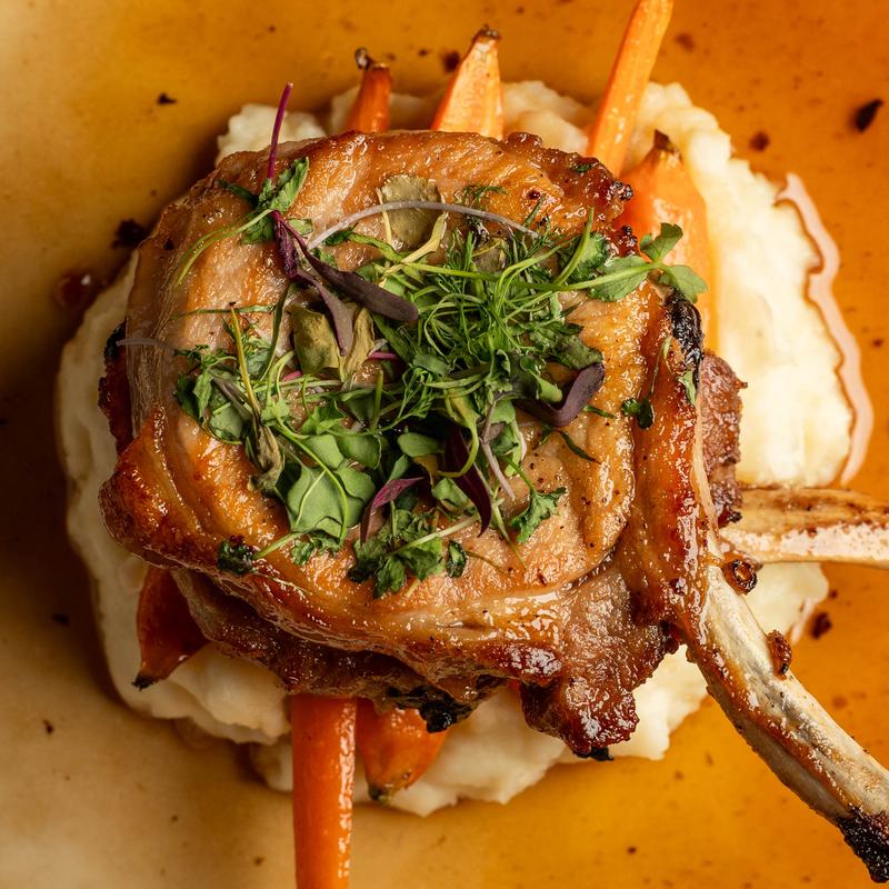 Roasted pork chop, herbs, candied carrots, bourbon sauce, and creamy mashed potatoes