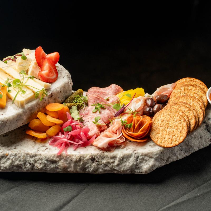 Selection of fine meats, nuts, seasonal fruits, crackers and locally sourced cheeses